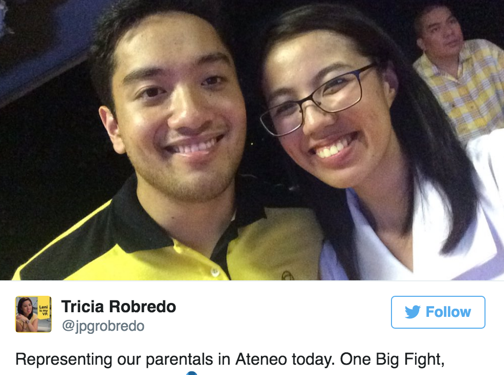 Don’t they look good together — Liberal Party’s (LP) young campaign ambassadors: Mar Roxas’ son, Paolo Roxas, together with Leni Robredo’s daughter, Tricia Robredo.