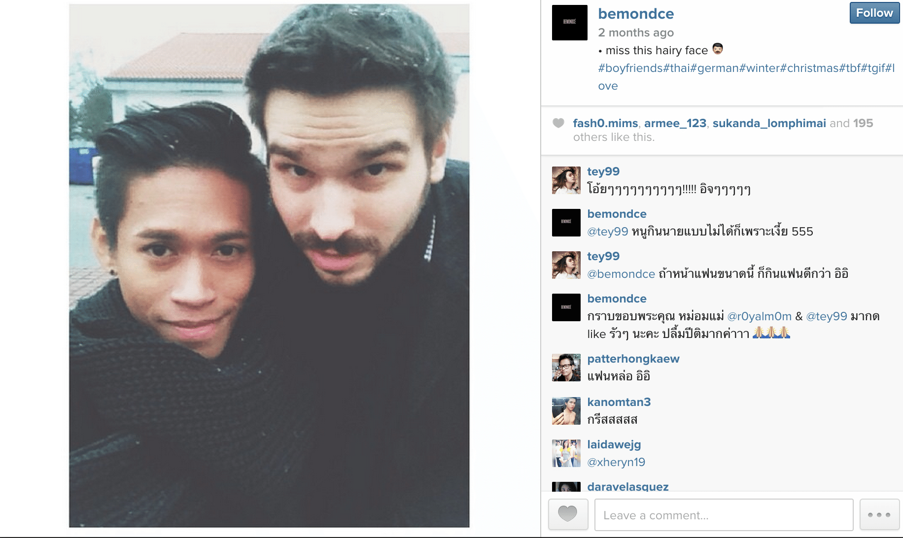 We woke up this morning with a viral photo of a cute gay couple (a hot German guy holding hands with a twinky tanned Asian boy wearing a striking blonde hair) while riding a train. This seems to be in Bangkok based on @bemondce’s Instagram page.